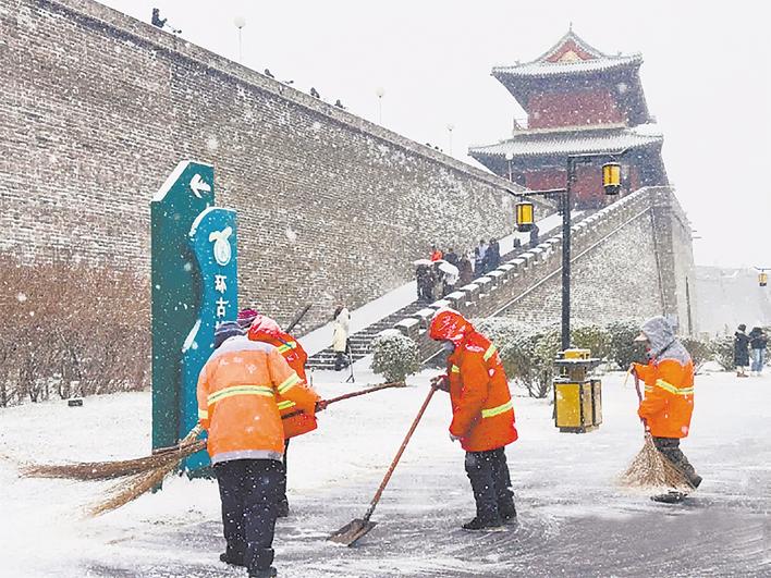 环卫工人在正定南城门扫雪。 高小卓 摄
