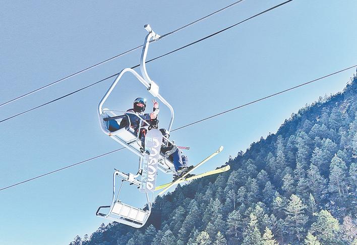 在四川省阿坝藏族羌族自治州的汶川羌人谷滑雪场,滑雪爱好者乘坐吊椅前往雪道顶。