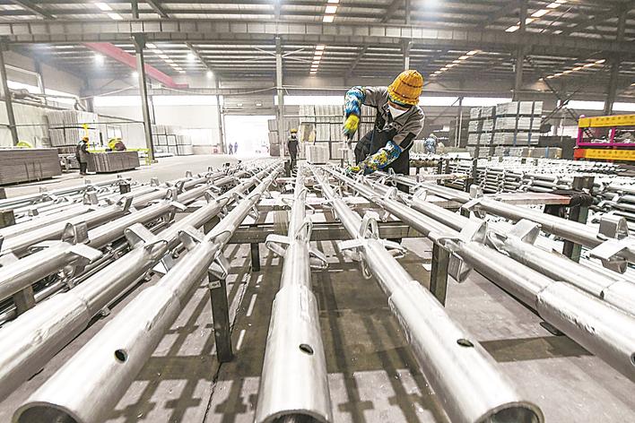 12月12日,工人在唐山市乐亭县经济开发区的一家脚手架生产企业车间工作。