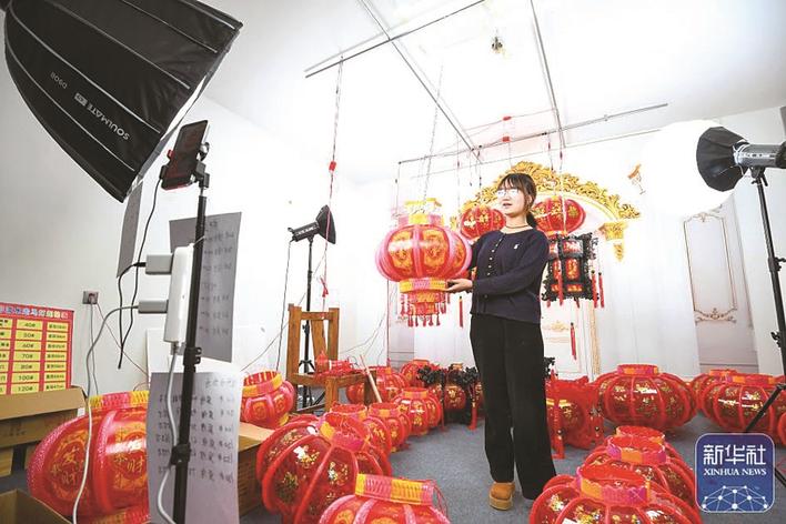 12月10日,在石家庄市藁城区屯头村一家宫灯销售处,直播人员进行线上销售。新华社发(张晓峰摄)