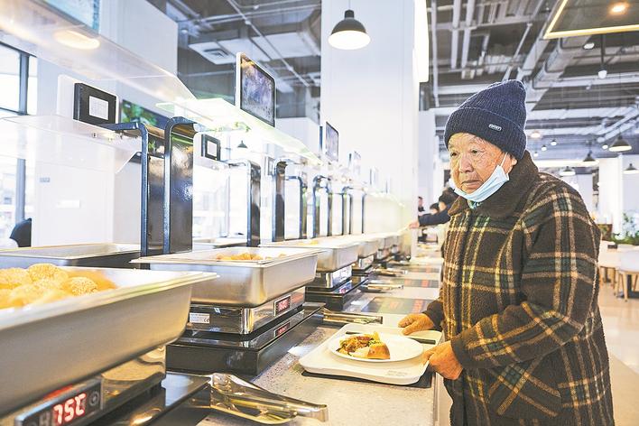老年人在雄安新区文华社区华序府智慧食堂内取餐。