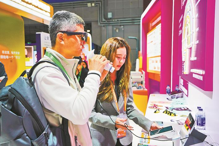 参观者在进博会医疗器械及医药保健展区阿斯利康展台体验一款肺功能测定仪。