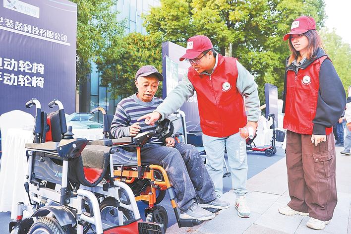 老年人在志愿者指导下体验电动轮椅。