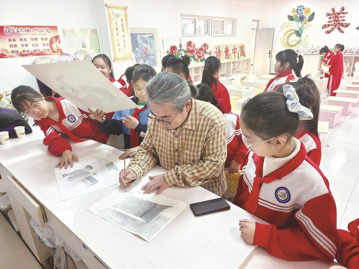 路北区美术家协会志愿者走进世嘉实验小学,和同学一起用五彩画笔描绘家乡画卷。
