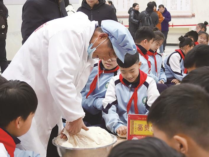 在宫面印象非遗汇客厅,学生们近距离观察师傅和面。本报记者 朱昊明 摄