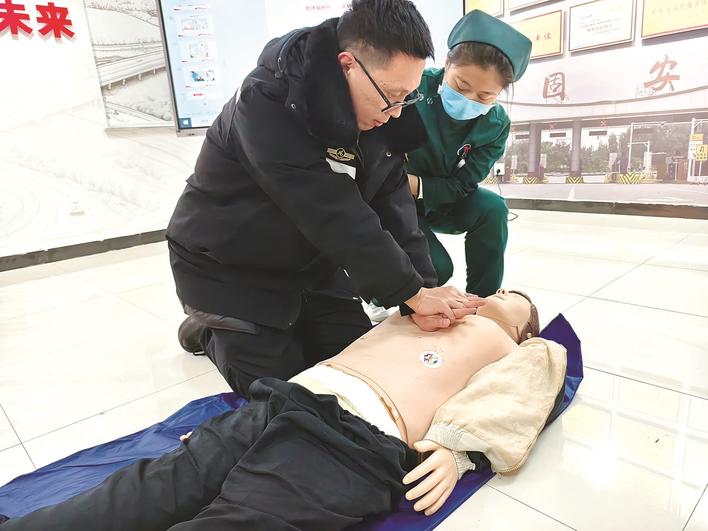 日前,河北高速大广分公司南宫应急大队衡水分点与衡水市第五人民医院联合开展应急救护知识实训,通过“理论讲解+实操演练+情景应用”的方式,向应急队员讲解演示心肺复苏、创伤包扎、使用自动体外除颤仪等急救技能,增强全员应急救护意识,提升应对突发事件的处置能力。图为应急队员利用人体模型进行实操演练。 记者 常虹 通讯员 周佳 牛茂伟 摄