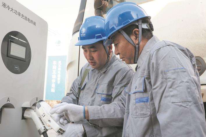 唐山供电公司员工到唐山市曹妃甸电动重卡兆瓦级车网互动示范站开展设备检查。周宇翔 供图