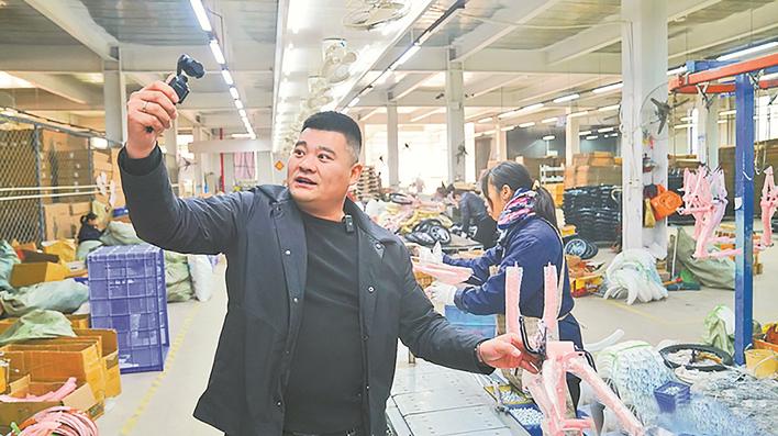 朱宗达在车间生产线上给直播间粉丝介绍产品。杨泽 摄