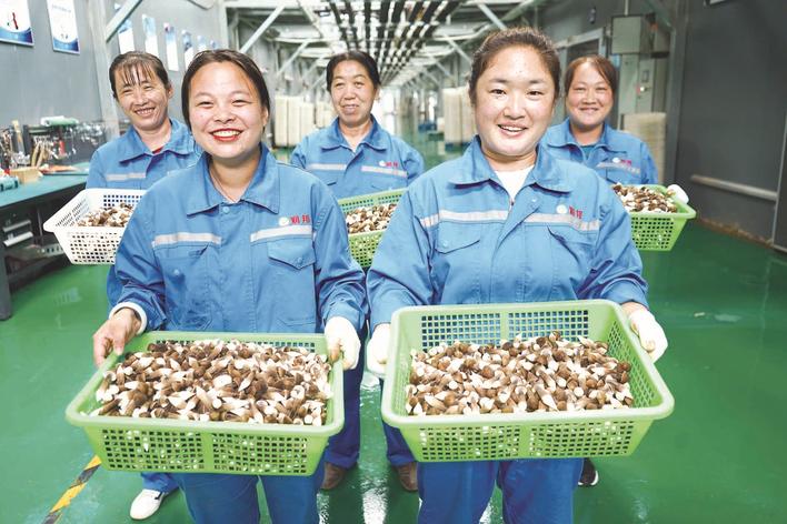 近日,走进承德滦平安纯沟门镇的5G智慧农业现代化珍稀食用菌生产车间,食用菌立体栽培架并排摆放,温度、湿度全部由电脑控制,几位工人正在采摘、削根,一刻不停闲。近年来,滦平县立足自身食用菌产业基础,不断优化产业结构,打造智慧农业园区,助力食用菌产业提档升级,助农增收。图为工人展示采摘的黑皮鸡枞菌。