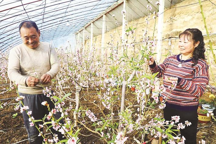 平泉市认真实施“科技兴农”战略,大力推动时差林果基地建设,发展农业特色种植产业,促进农民致富增收。图为平泉镇农民在温室棚内管理桃花。李平文 摄