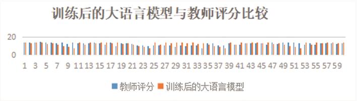 从图2可以看出,进行训练后,大语言模型和的评分更接近教师的评分,大语言模型平均分为12.533(教师评分的平均分为12.575分)两者已经很接近了。但从存在个别学生教师评价比大语言模型评价高的比较多的情况。