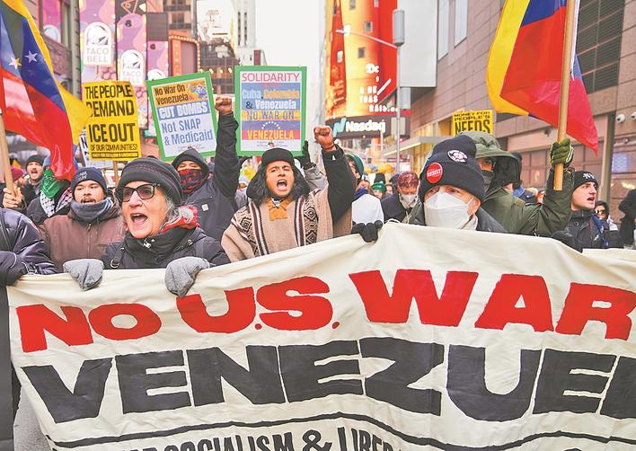 1月3日,在美国纽约,民众参加抗议集会。 当日,近千名民众在美国纽约举行集会游行,抗议美国对委内瑞拉实施军事打击。新华社记者 张凤国 摄