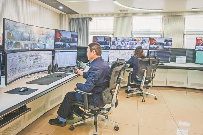 黄骅港务集控室内,操作人员紧盯电脑屏幕监视现场作业。梁雪冰 摄