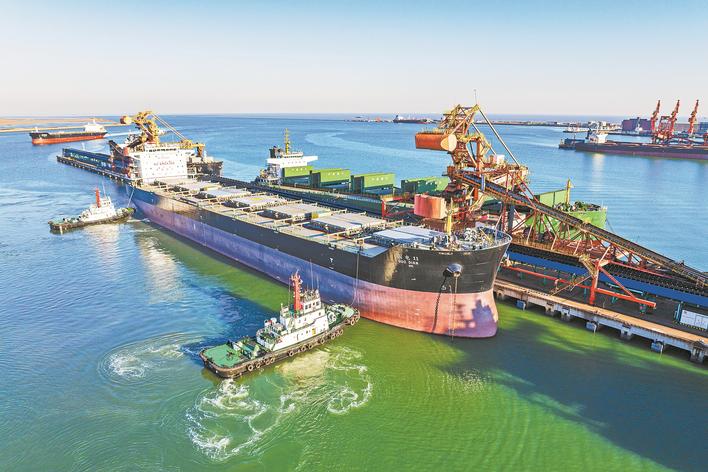 货轮在拖轮的助力下停靠在黄骅港务装船泊位等待装煤。梁雪冰 摄