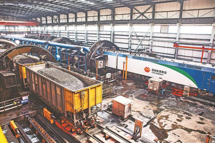 渤海湾穹顶处,黄骅港煤炭码头作业现场车辆轰鸣,货轮交错。一列列煤炭由西向东而来,一艘艘货船载煤下海向南而去,寒冬中,电煤保供热火朝天的港口景象正在持续上演。