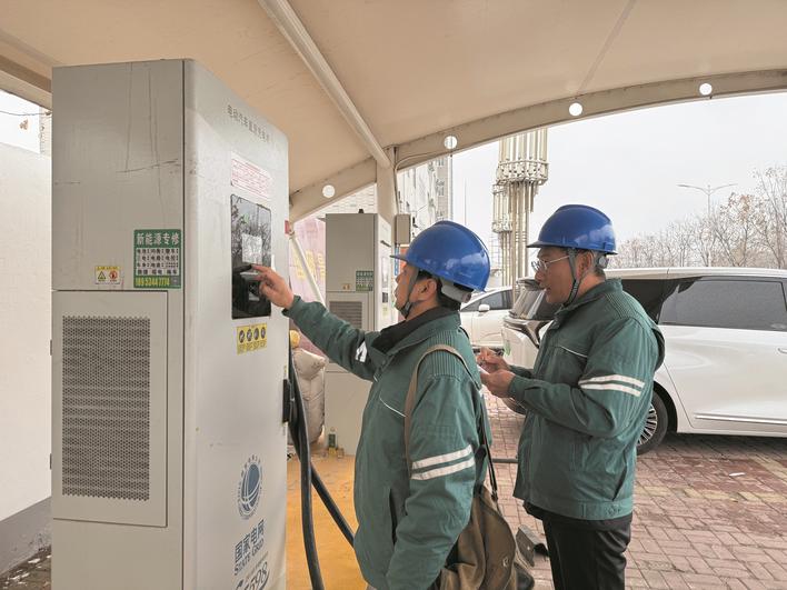 元旦假期,景县供电公司工作人员对县城南电动汽车充电桩设施开展巡视检查,保证充电设施安全运行,护航广大群众绿色出行无忧。赵蕊 摄