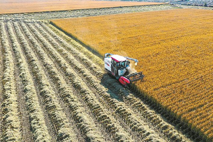 农民驾驶农机在河南省信阳市光山县正礼生态农业开发有限责任公司水稻种植基地收割晚稻。