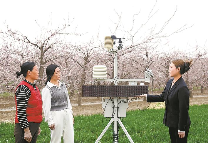 邢台市南和区气象局工作人员指导和阳镇沙道村农民利用移动气象站观测气象数据,助力智慧农业发展。