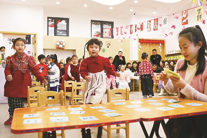 日前,桥东区红旗楼幼儿园开展亲子活动,家长参观孩子们一年的学习成果、进行亲子互动游戏,共迎充满希望和美好的新春。图为小朋友与家长在做游戏。岑屹 张茜 摄