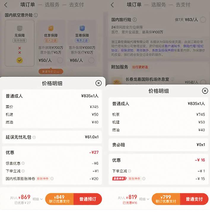 “看似最便宜,实则更昂贵”。部分平台瞄准用户“比价选低”的消费习惯,通过“价格诱导”策略引导点击。例如,在某订票App上,系统按价格从低到高排序后,页面最低价显示为698元,可到了结算环节,这个票价还要加上被捆绑的61元延误礼包,即便减去平台给的27元优惠,最终实付金额为869元。而当消费者返回重新选择标价为709元的“裸价”机票时,在机票、基建费、燃油费完全相同的前提下,虽然只能减去16元的平台优惠,却因无捆绑礼包,最终实付仅为819元,反而比所谓的“最低价”便宜50元。