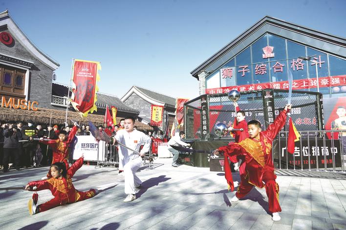 1月10日,“狮城荣耀·沧州擂”首场公开赛于南川楼狮子综合格斗馆前广场启幕。活动现场,八极拳、劈挂拳、燕青拳、六合拳等传统武术展演率先亮相。随后的全民擂台环节,以开放式挑战与趣味对抗的形式,吸引了外卖员、保安等各行各业的普通劳动者登台。本报记者 崔上 摄