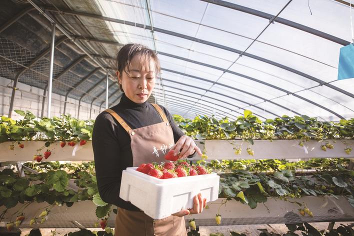 青纱帐蔬菜种植合作社工人在采摘成熟的草莓。赵江涛 摄