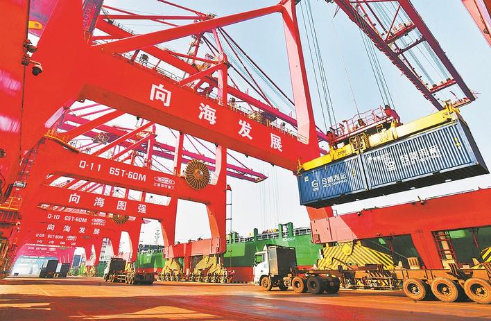 1月15日,在黄骅港综合港区集装箱码头,岸桥设备在进行卸船作业。
