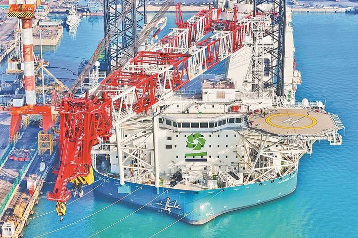 这是1月15日在中集来福士山东烟台建造基地拍摄的“北欧之源”号风电安装船(无人机照片)。 1月15日,由中集来福士为比利时建造的风电安装船“北欧之源”号在山东烟台交付。该船采用全直流供电模式,配备新型电池混合动力驱动系统,可有效减少建造成本、使用能耗与碳排放量。 新华社发(唐克 摄)