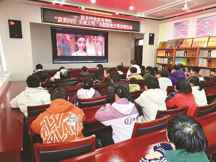 日前,蔚县特殊教育学校创新德育形式,组织开展“蔚爱同行 共建文明”电影放映文明实践活动,以光影艺术为载体,着力加强对特殊学生的思想道德建设,提升学生的文明素养与社会适应能力。图为电影放映现场。樊子良 摄