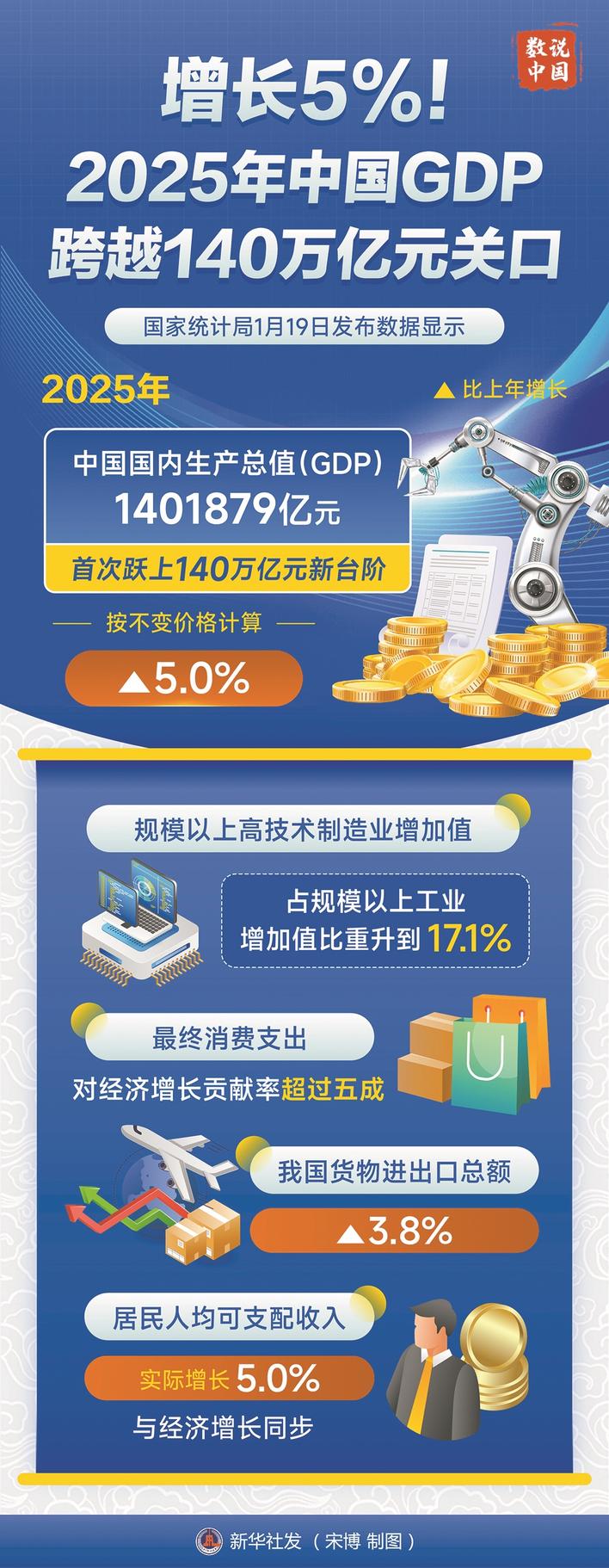 经济总量跨越“140万亿元”关口!2025年中国经济成绩单1月19日发布。过去一年,面对外部环境急剧变化、国内困难挑战增多的复杂严峻形势,中国经济依然保持5.0%的增长速度,在主要经济体中名列前茅,这份成绩尤为可贵。“难”与“成”的对照中,显现中国经济高质量发展的大势,蕴含乘风破浪勇往直前的密码。