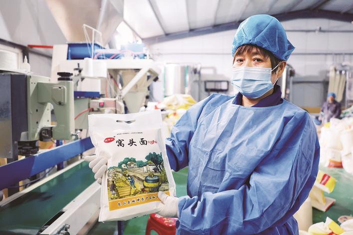 盐山县杨集镇持续做好杂粮深加工和市场销售“后半篇文章”,推动特色杂粮产业向标准化、品牌化方向发展,全力谱写乡村振兴新“丰”景。图为工人展示生产的杂粮产品窝头面。 张金元 杨博文 刘超 摄