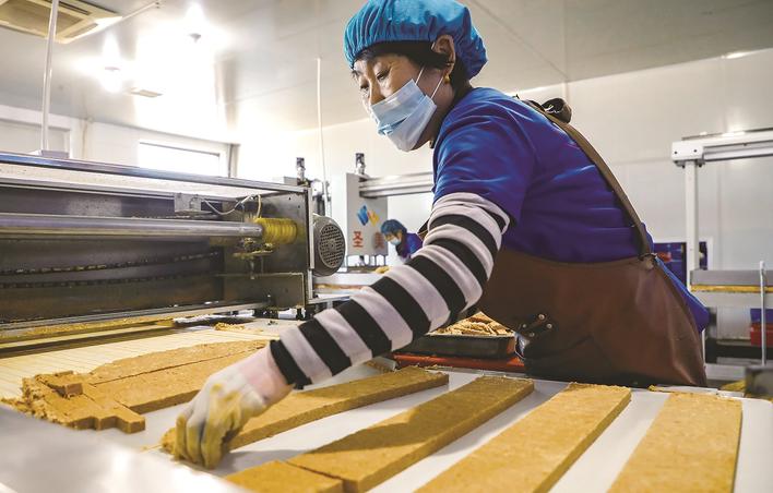 花生酥糖是唐山地区的传统特色食品。近年来,当地引导企业升级生产技术,在保留传统风味的基础上,推进标准化生产,让老味道持续飘香。图为生产车间内,工人在制作花生酥糖。刘洋 陈军 摄