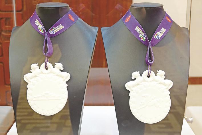 完赛奖牌与文创产品成为本届赛事的一大亮点。奖牌延续“一年一生肖、一年一名胜”主题,以定州贡院为主体造型,融合生肖马元素,寓意“马到成功”,设计灵感源自三件馆藏文物,顶端“辟邪”“天禄”祥兽捧平安扣,形成“祥兽擎珠”吉祥意象。奖牌采用定瓷非遗技艺,经36道工序、1320℃高温烧制,搭配手工编绳工艺,每一枚均为独一无二的艺术品。同时,赛事推出“定瓷十二生肖平安扣”“定瓷续福可乐杯”两款文创产品,男女前50名选手可获赠。