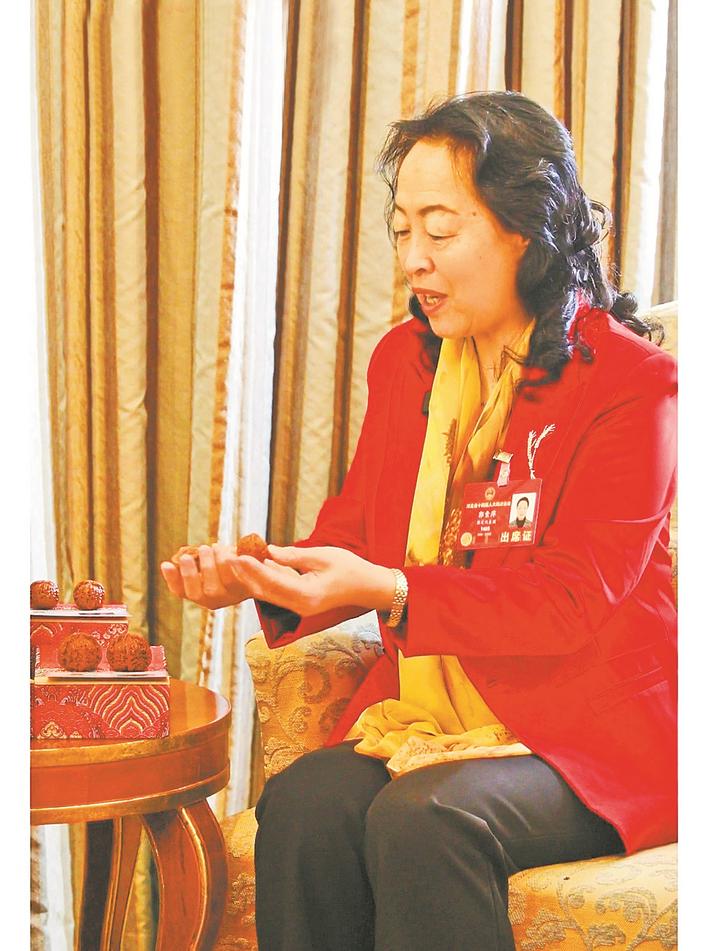 “你看它是三个棱,纹路很好看,还特别好上色。”省人大代表郭素萍拿着一对麻核桃向记者介绍。