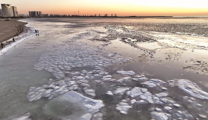 连日来,秦皇岛市海港区金梦海湾片区海域出现海冰景观,清晨时分的晨光为冰面镀上金边,冰晶折射出细碎光芒,冷暖色调交织出浪漫氛围,凭一抹冬日限定风情,吸引游客前来拍照留影,记录这份冬日限定美景。图为海冰景观。曹建雄 摄