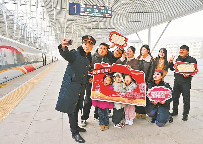 1月26日,铁路工作人员和乘坐G359次列车的乘客在延安站站台合影留念。