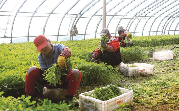在固安县牛驼镇顺斋瓜菜种植专业合作社大棚内,菜农在给茼蒿去叶。张琛 摄