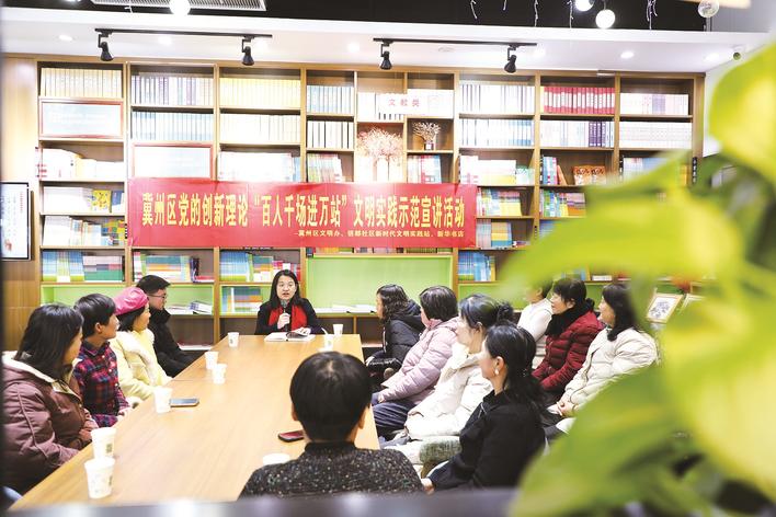 1月22日上午,冀州区党的创新理论“百人千场进万站”文明实践示范宣讲活动在该区新华书店举办。活动以群众喜闻乐见的文艺形式为载体,宣讲员用通俗易懂的语言、鲜活生动的案例进行宣讲。图为活动现场。刘延岭 摄