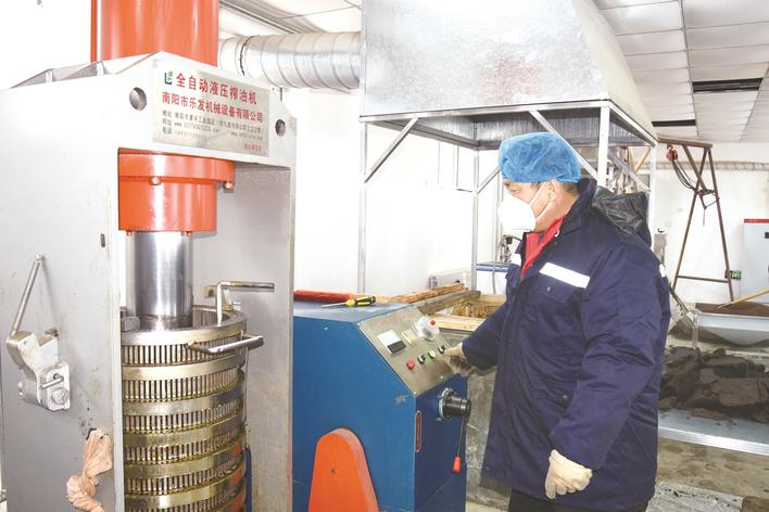 日前,在张家口市下花园区定方水乡崔家庄村的老油坊,工人在察看胡麻油压榨过程。老油坊传承百年传统工艺,采用传统技法物理压榨生产胡麻油,古法工艺历经7道工序,能够保留油料最本真的香味和营养。院玉顺 摄