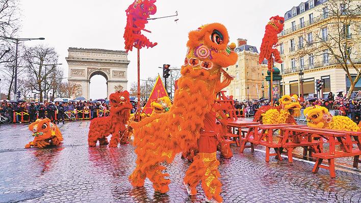 这是2月1日在法国首都巴黎的香榭丽舍大街拍摄的醒狮表演。 “欢乐春节满巴黎·龙狮贺岁舞香街”春节巡游活动2月1日在巴黎香榭丽舍大街举行,庆祝即将到来的农历春节。这是该活动第四次亮相香榭丽舍大街,吸引了大街两侧的巴黎市民和游客驻足观看。新华社记者 崔可欣 摄