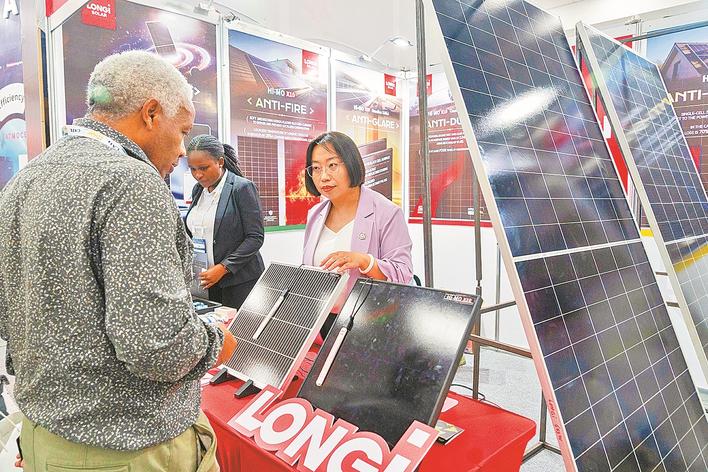 2月3日,在肯尼亚首都内罗毕,参展者在2026年非洲国际太阳能展的隆基乐叶展台了解光伏产品。 2月3日至4日,2026年非洲国际太阳能展在肯尼亚首都内罗毕举行,重点聚焦太阳能光伏、能源储存技术和智能充电基础设施等行业热点,旨在推动行业发展、促进技术交流与商业合作。该展会吸引了数十家公司参展,其中包括华为、宁德时代、隆基乐叶、宁波德业等多家中国企业。新华社记者 谢剑飞 摄