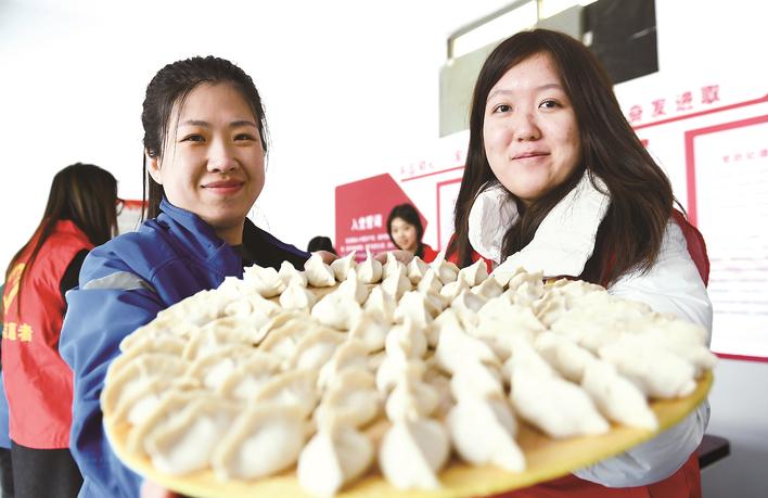 近日,为切实关爱一线新就业群体,让快递从业者感受冬日温情与社会关怀,大城县组织开展了关爱快递员主题活动。工作人员将精心准备的米面等生活物资逐一送到快递员手中。图为工作人员和快递员展示包好的饺子。刘亮 摄