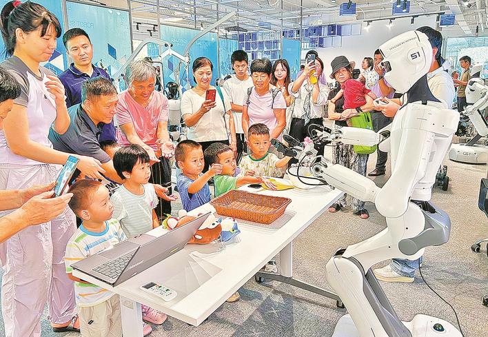 2025年7月28日,全球首家机器人6S店在深圳市龙岗区的机器人剧场开业,图为参观者在机器人6S店与机器人互动。