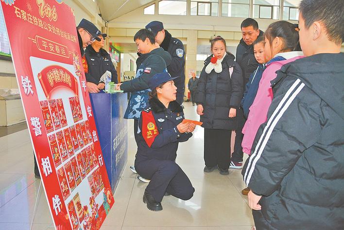 春运开启以来,石家庄铁路公安处邢台站派出所联合多家单位在火车站候车室举办“安全带回家,祥和过大年”主题活动。现场设置安全知识福袋抽答环节,旅客参与互动可获趣味盲盒。同时开设书法区赠送春联福字,将平安祝福融入佳节问候,提升旅客出行安全意识与体验。通讯员 米海磊 摄