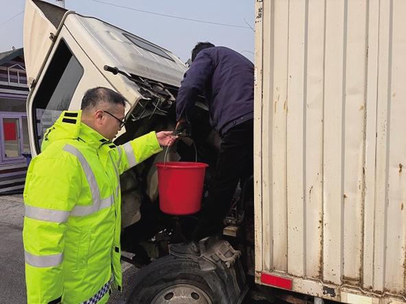 2月4日,一货车行驶至河北交投沿海高速公路有限公司南戴河站路段,水箱水温异常飙升。该公司员工携带应急工具,疏导车辆至安全区域,并从便民服务点提水为水箱散热器喷淋降温,避免了事故发生。陈拓宇 摄