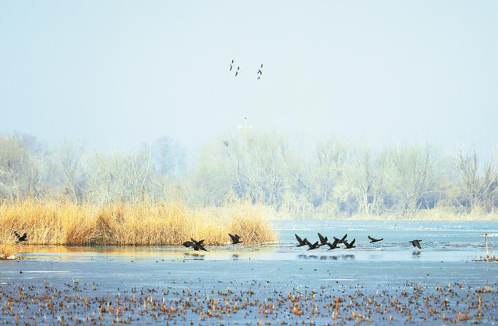 鸬鹚在衡水湖的冰面上空低飞。新华社发