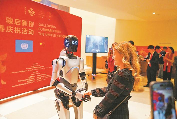 2月9日,在联合国总部举行的“骏启新程”新春庆祝活动上,一名嘉宾和机器人握手。 2月9日,中国常驻联合国代表团在位于纽约的联合国总部举办“骏启新程”新春庆祝活动,联合国秘书长古特雷斯在视频致辞中用中文向中国人民致以新春问候,并感谢中国和中国人民对多边主义和全球团结事业的大力支持。新华社记者 张凤国 摄