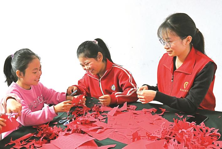 近日,大城县开展大学生“返家乡”寒假社会实践活动。300余名学子在公益服务、社区实践、乡村振兴、公共文化等领域开展实践。图为在大城县津保东路社区新时代文明实践站“快乐寒假”手工课上,返乡大学生志愿者在指导小朋友剪纸。金胜利 刘雅娜 摄