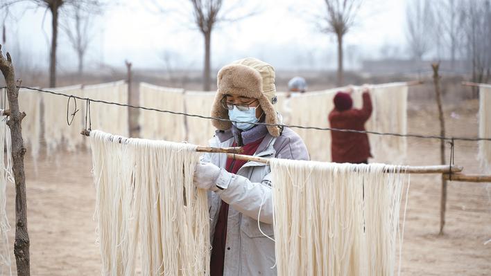 连日来,在广宗县大平台乡洗马村的粉条加工坊里,工人熟练地完成和面、漏粉、捞粉、挂粉等工序,一缕缕晶莹剔透的红薯粉条顺势而出,晾晒架上挂满的粉条,在冬日里勾勒出一幅丰收致富的生动图景。