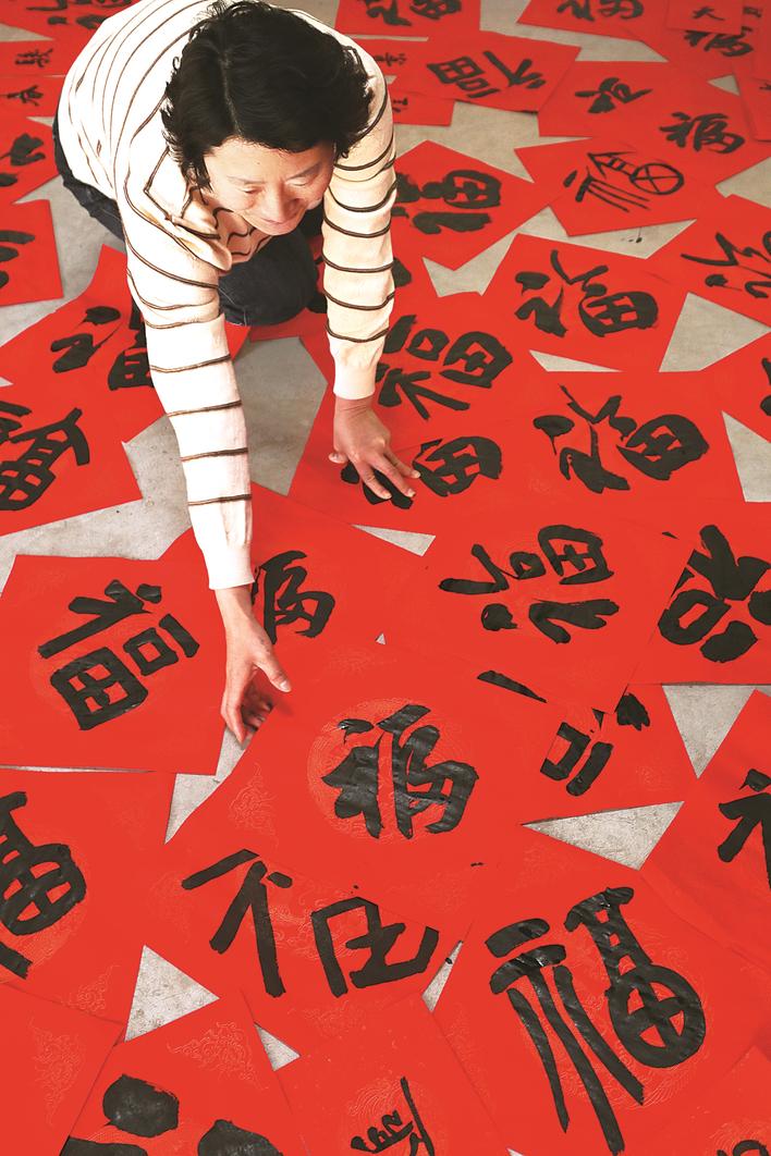 ②村民在晾晒书法爱好者刚写的“福”字。